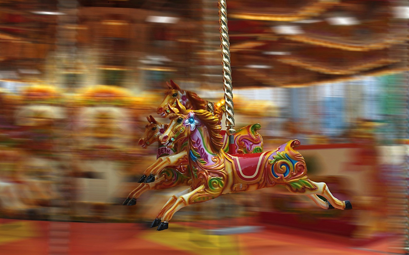 Round and round you go. Maybe it’s not your first time on one? You know the drill. Pick your horse, quickly choosing your color and scoot yourself on before they begin their dance. Up, down, all around you go. Of course there’s the choice of the bench that doesn’t glide up and down, but who would want that? Boring.